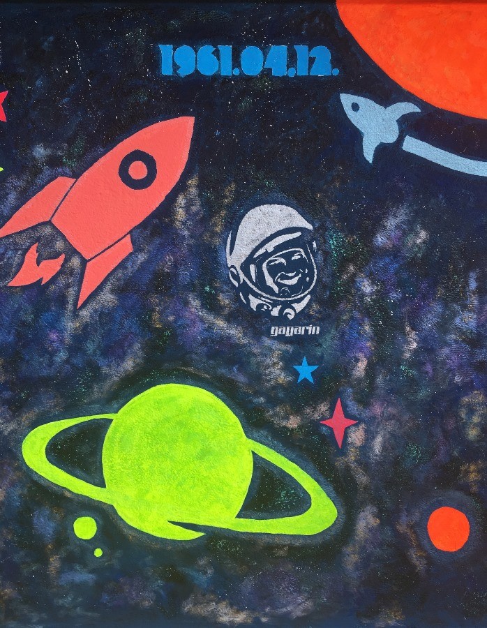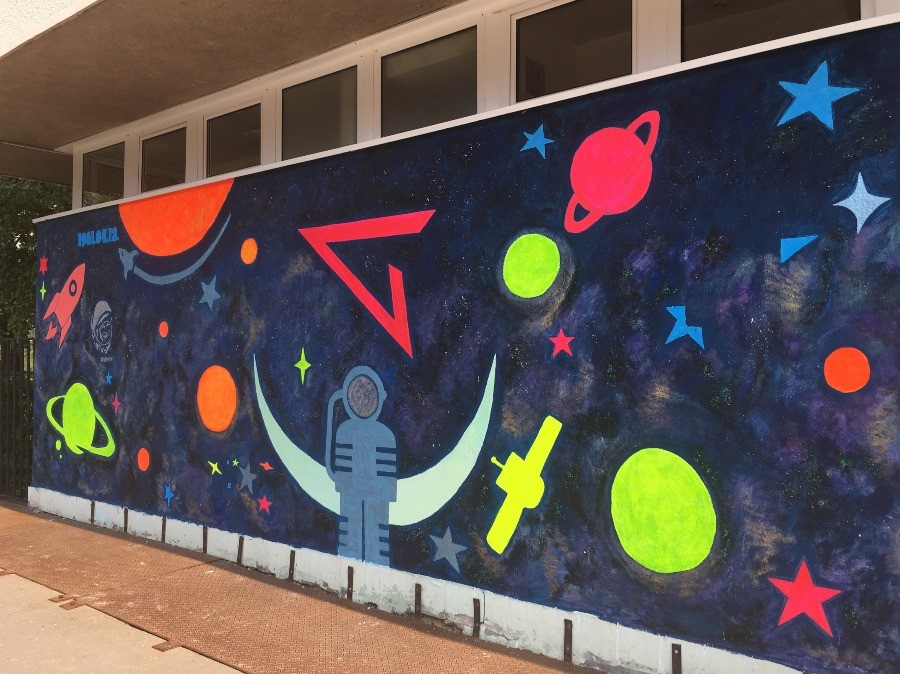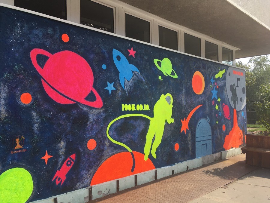 A Szerpentin úti hosszú lépcsősor után ezúttal a Gagarin általános iskola bejárata melletti falakat gondolták újra a közösségi festést Salgótarjánban meghonosító csapat tagjai az önkormányzat játszóházépítési és játszótér-felújítási projektje keretében. A téma ezúttal - nem túl meglepő módon - az űr volt.