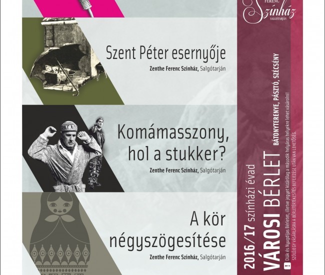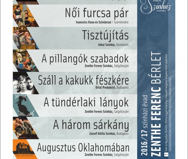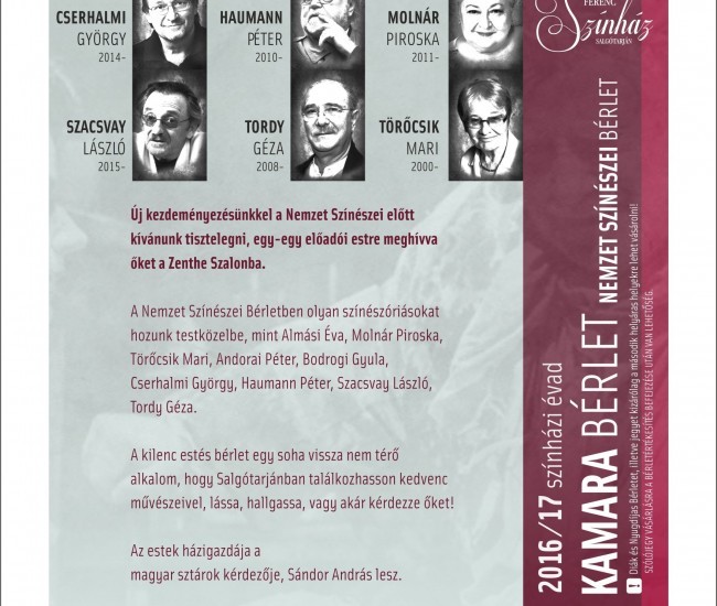 Öt premierrel és két új bérletsorozattal készül a 2016/17-es évadra a salgótarjáni Zenthe Ferenc Színház. Egyik új kezdeményezésükkel a Nemzet Színészei előtt akarnak tisztelegni, akiket egy-egy előadói estre hívnak meg a Zenthe Szalonba.
