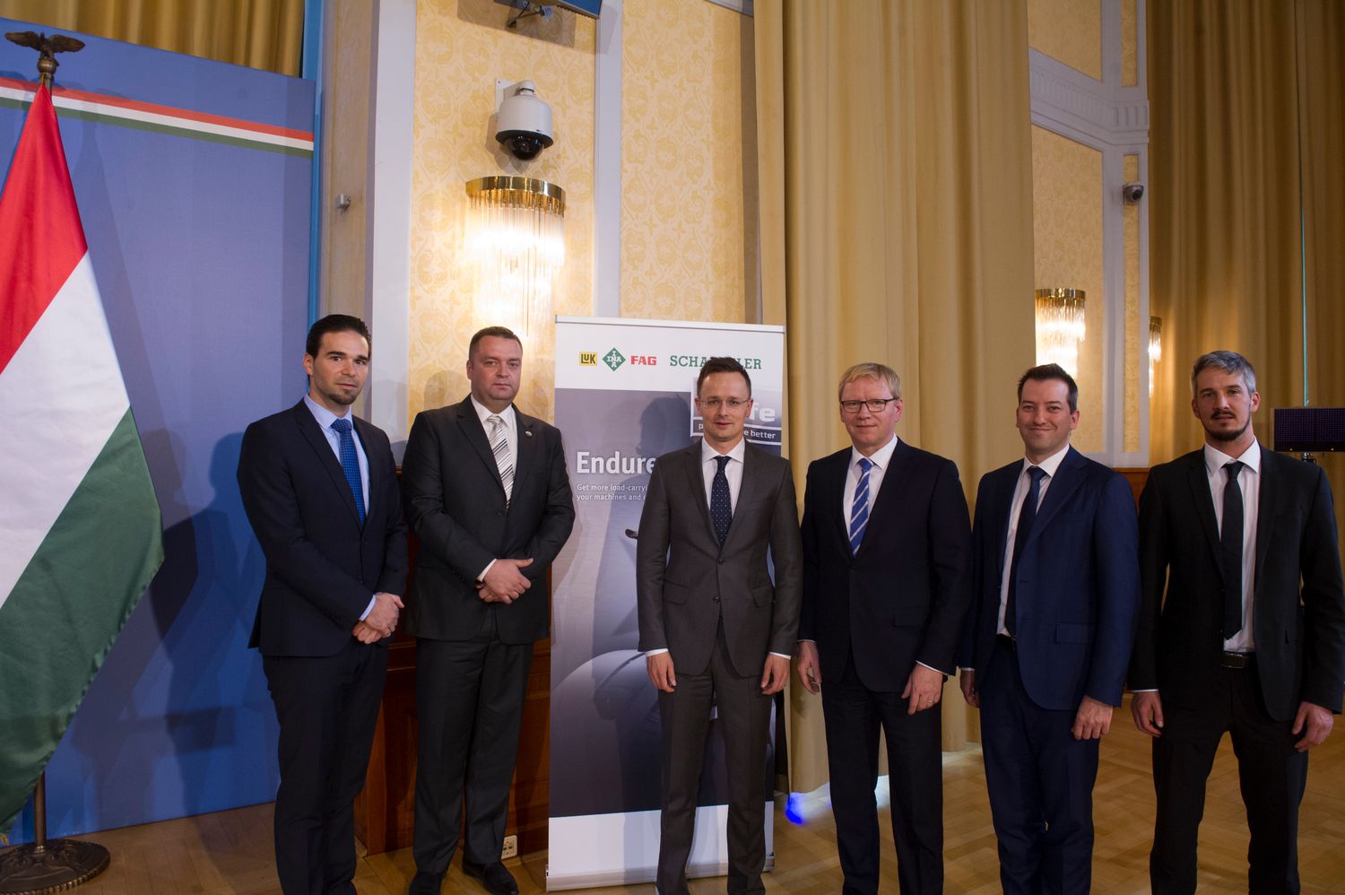 Szikora Levente, Szabó Péter az FAG Magyarország Ipari Kft. ügyvezetője, Szijjártó Péter külgazdasági és külügyminiszter, Dr. Lindner Rainer a Schaeffler Csoport közép- és kelet európai alrégiójának vezérigazgatója, Ésik Róbert a Nemzeti Befektetési Ügynökség elnöke és Dr.Barcsa Lajos Debrecen alpolgármestere a bejelentést követően